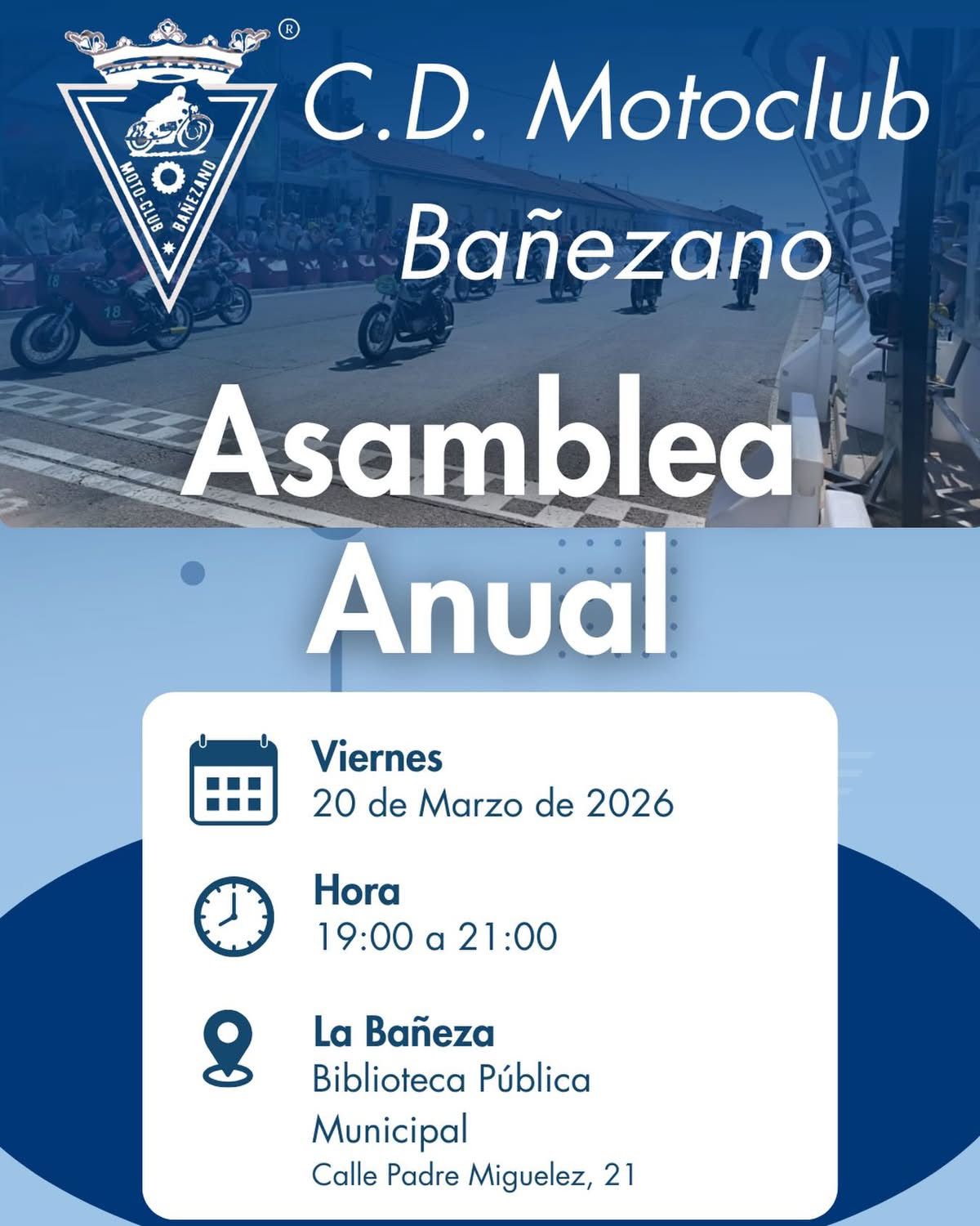 La Junta Directiva del Moto-Club Bañezano tiene el placer de convocarle a la Asamblea General Ordinaria, que tendrá lugar en el salón de actos de la biblioteca municipal de La Bañeza, el viernes 20 de Marzo de 2026 a las 19:00h primera convocatoria 19:30h segunda convocatoria.