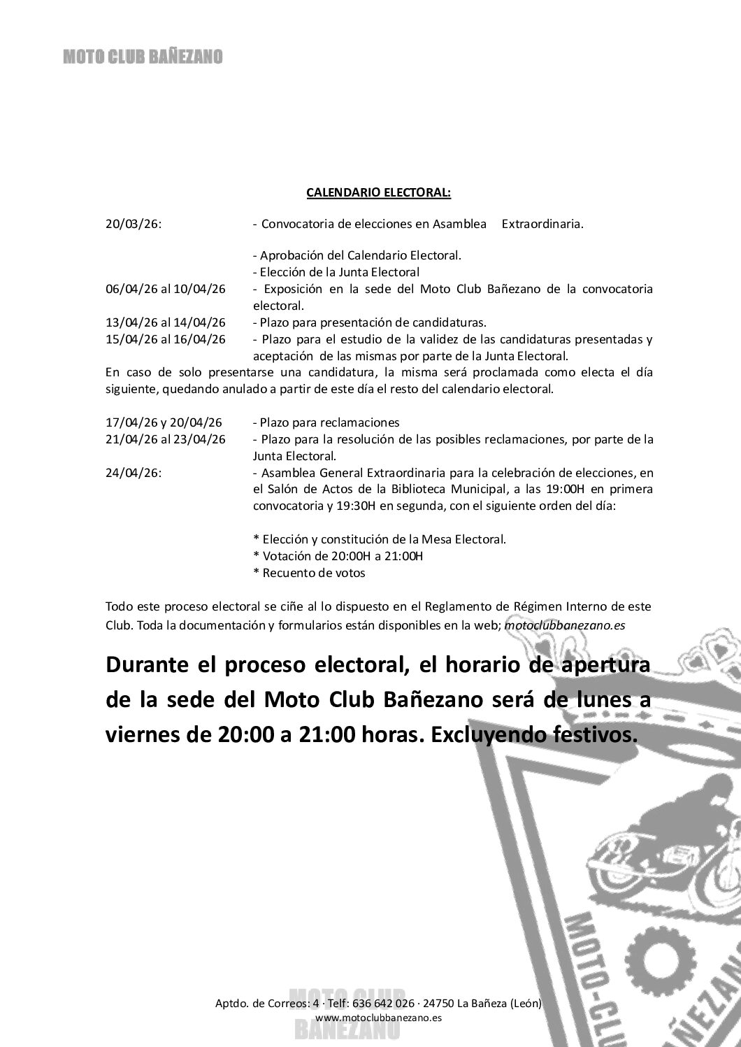Durante el proceso electoral la sede del Moto Club Bañezano estará abierta de lunes a viernes de 20:00H a 21:00H para resolver todas las dudas que cualquier socio tenga.